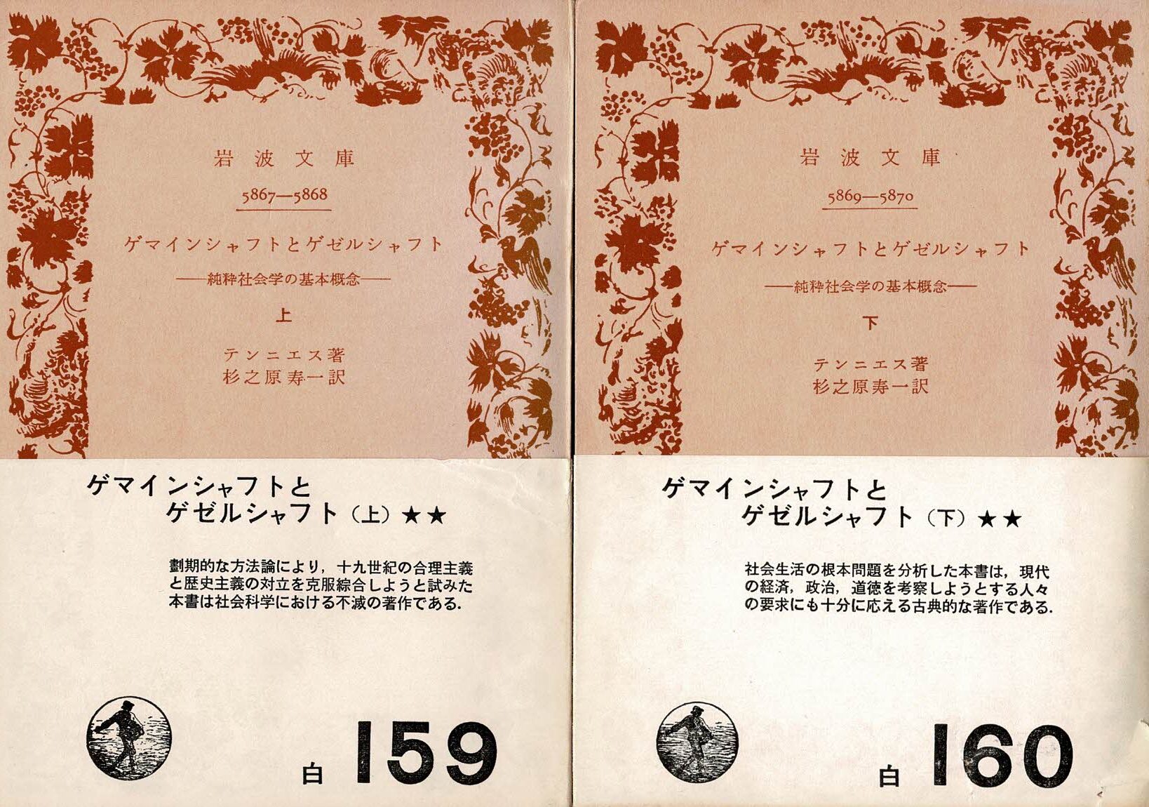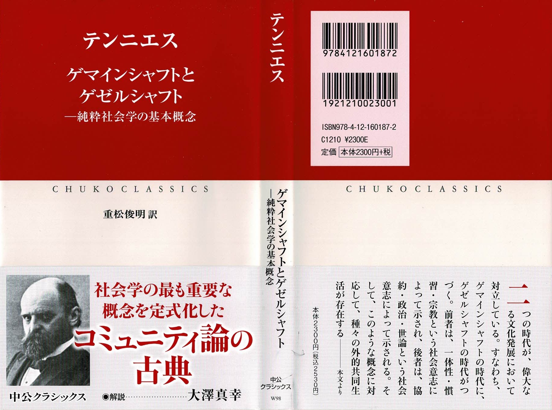1887年初版、1912年改訂増補版、テンニエス『ゲマインシャフトとゲゼルシャフト』重松俊明氏による抄訳 河出書房新社1963年初版が、中公クラシックスから先月、新たな解説と索引つきで改版刊行された。(全訳は、岩波文庫1957年 杉之原寿一 訳 上下巻がある。)